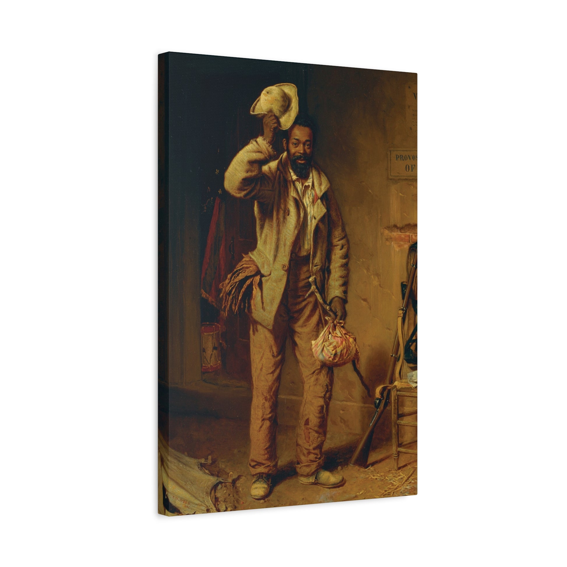 This piece 1/3 "The Contraband" (A term that referred to enslaved people who fled to Union lines at the beginning of the conflict.) Shows a self-emancipated man appearing in a U.S. Army Provost Marshall General office, eager to enlist.