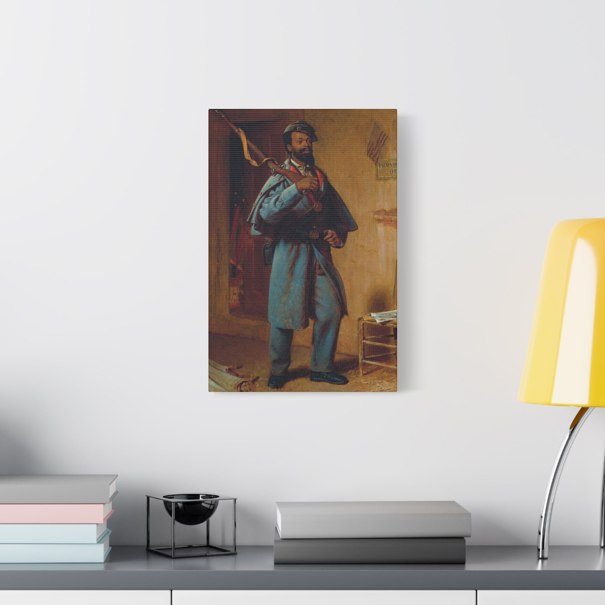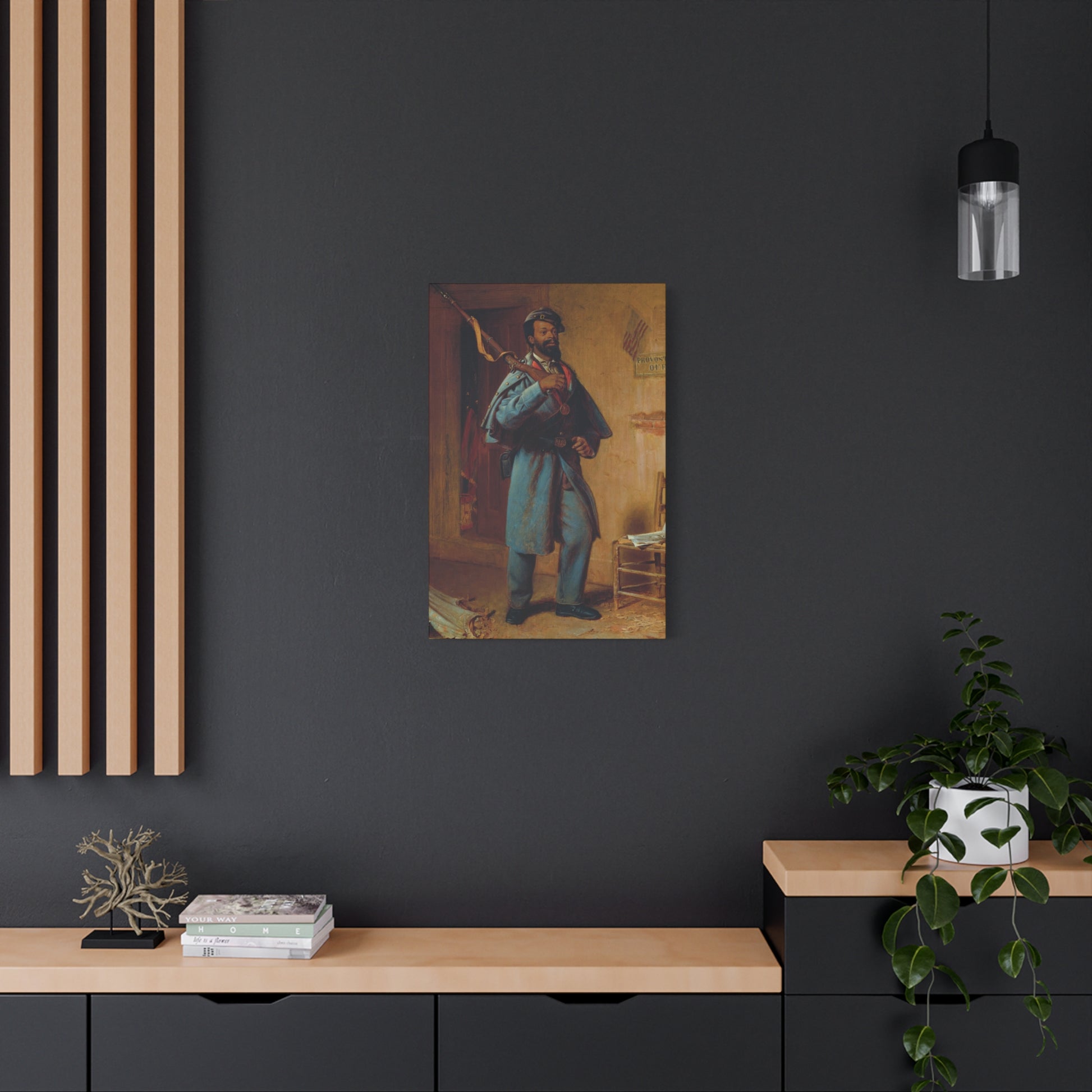 This work, painted at the close of the Civil War by Thomas Waterman Wood, forms a narrative triptych (Series of 3 pieces) of African American military service.