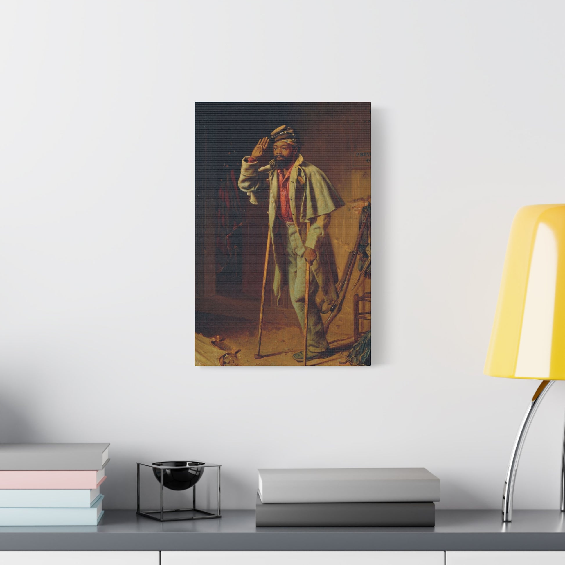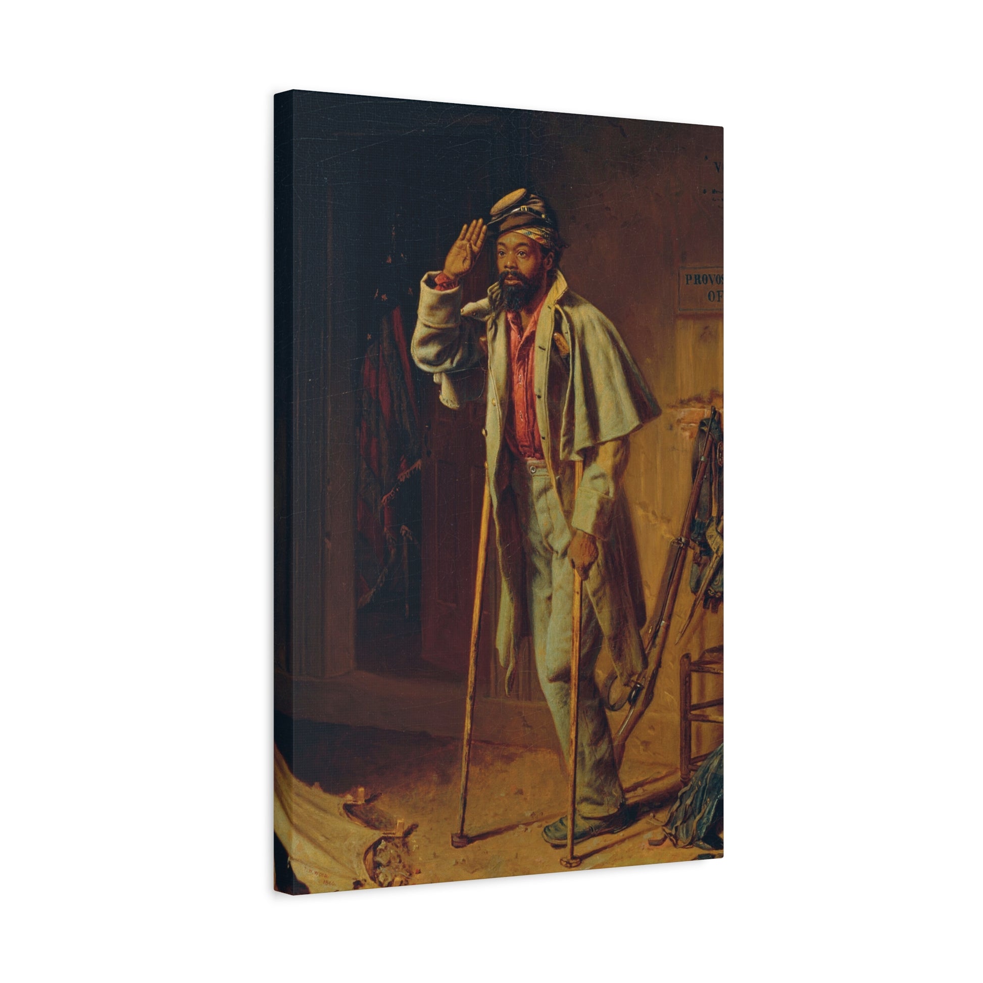 This work, painted at the close of the Civil War by Thomas Waterman Wood, forms a narrative triptych (Series of 3 pieces) of African American military service.