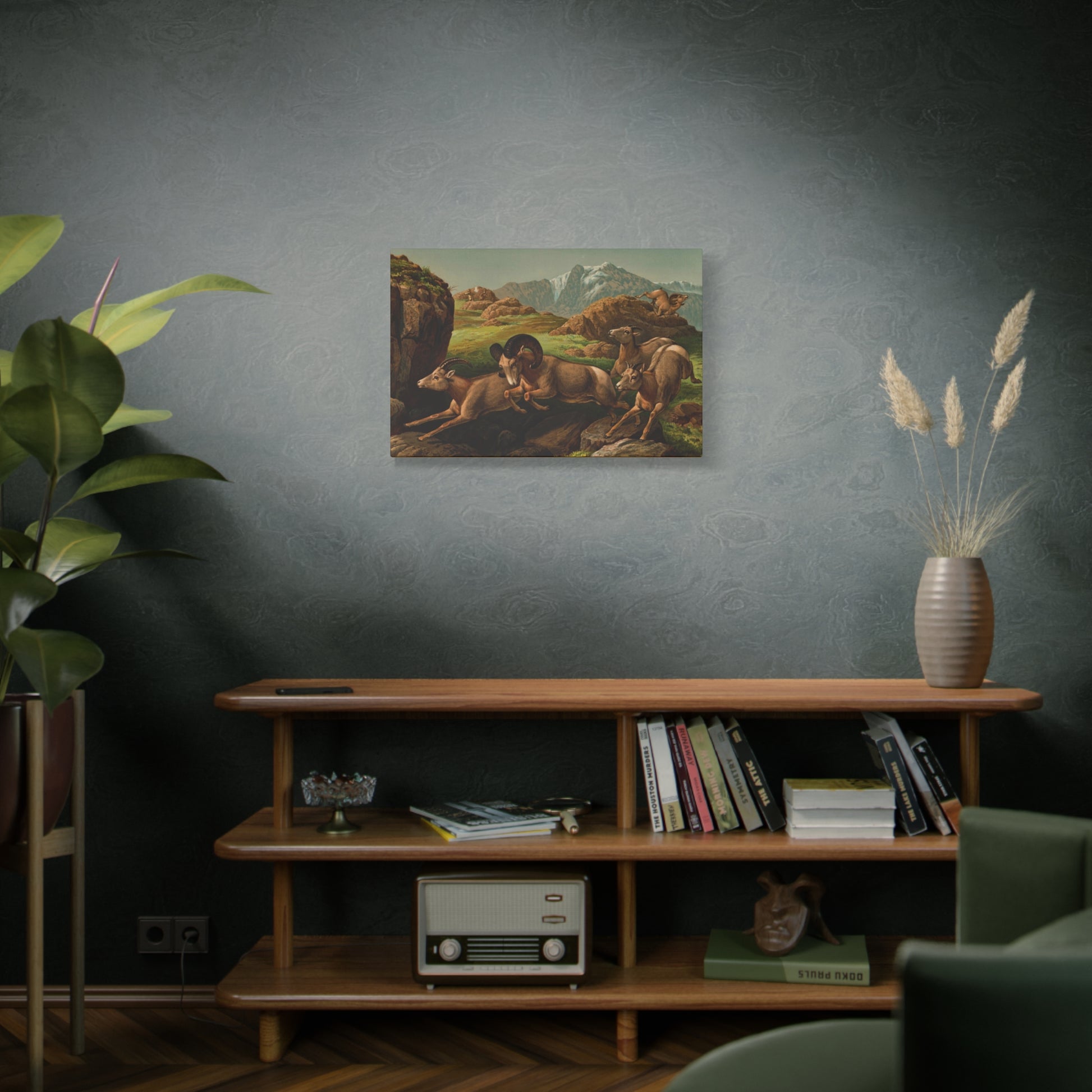 Painted by Edward Knobel, “A Hunt Above the Timberline” Depicts four big horn sheep running across boulders in the foreground. A fifth sheep falls, shot by one of two hunters visible in the background.