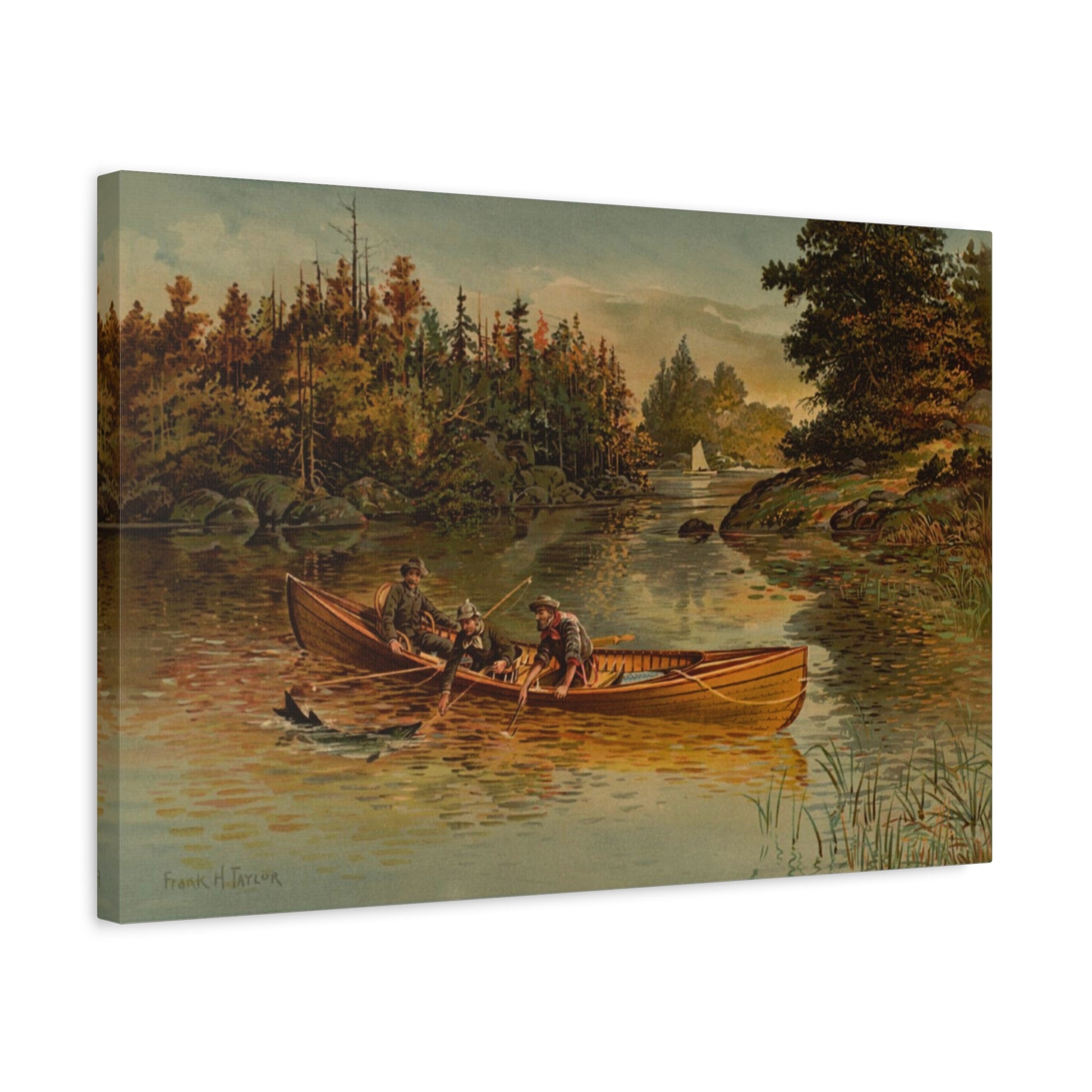 Painted by Frank H. Taylor. “Catching a Mascalonge” depicts three men in a boat pulling in a fish identified as a *mascalonge.
