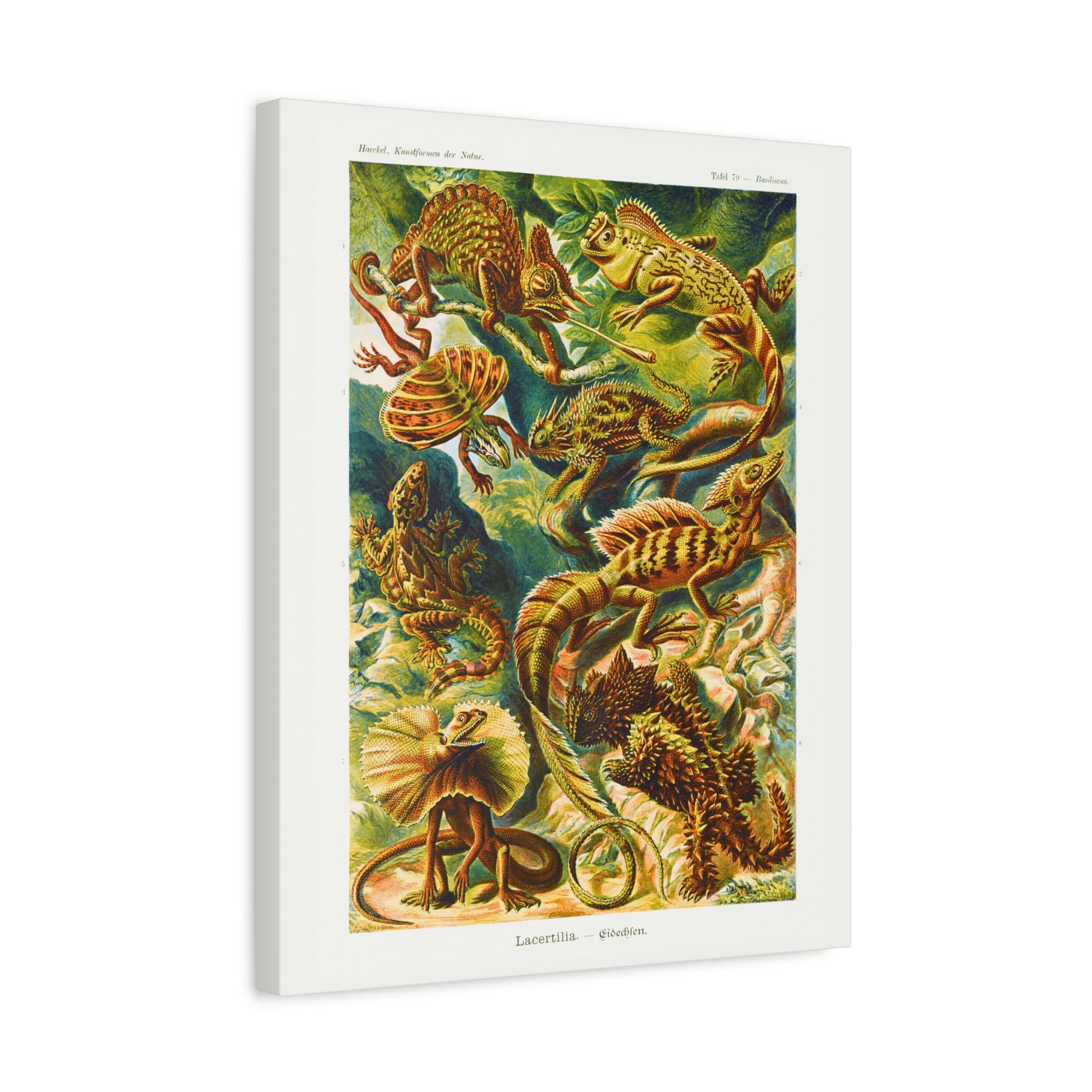 "Tafel 79" or Table 79 highlights the Lacertilia order of reptiles, more commonly known here as lizards. This is a page taken straight from "Kunstformen der Natur" or Art Forms in Nature published between 1899 and 1904 by German zoologist, naturalist, marine biologist, and artist Ernst Haeckel.