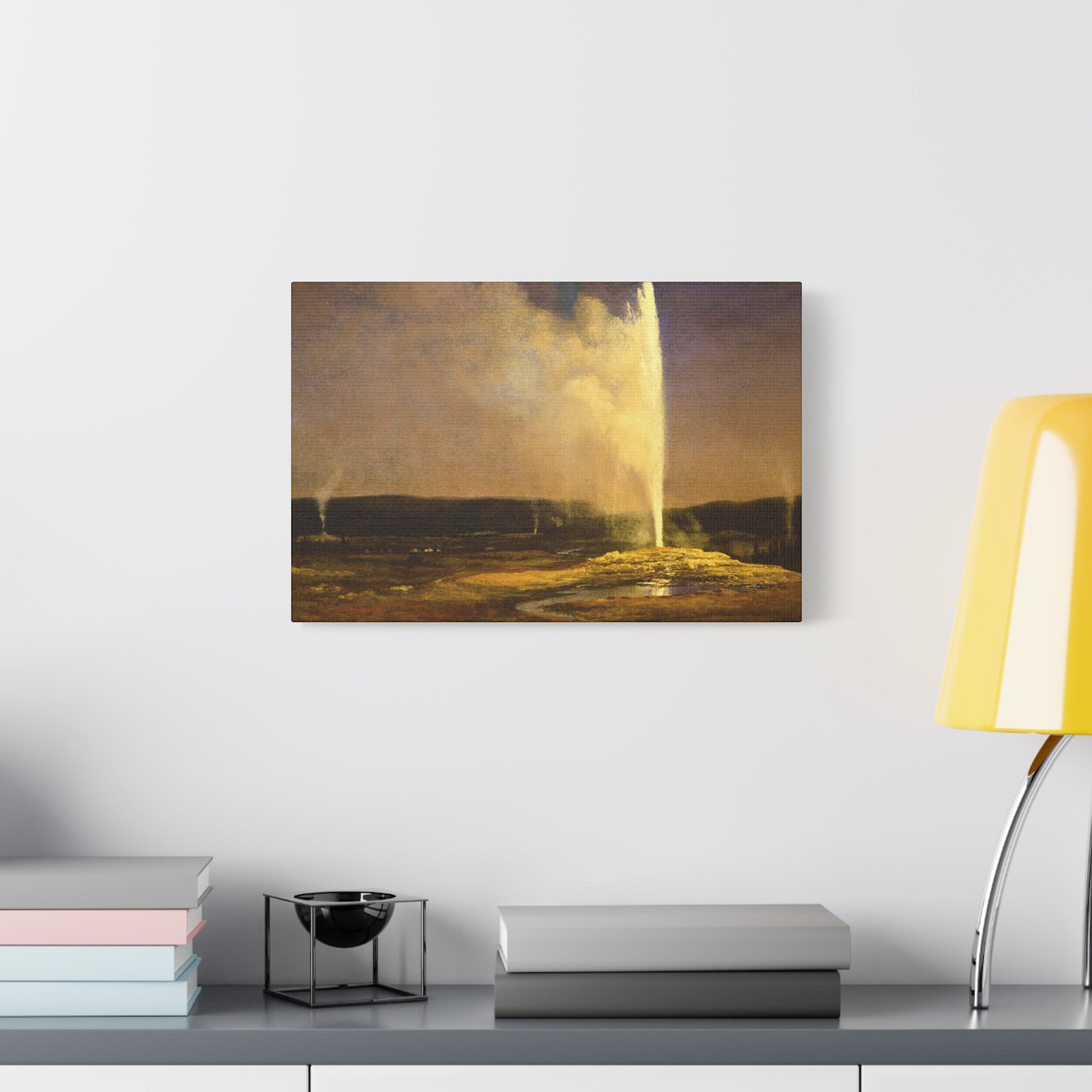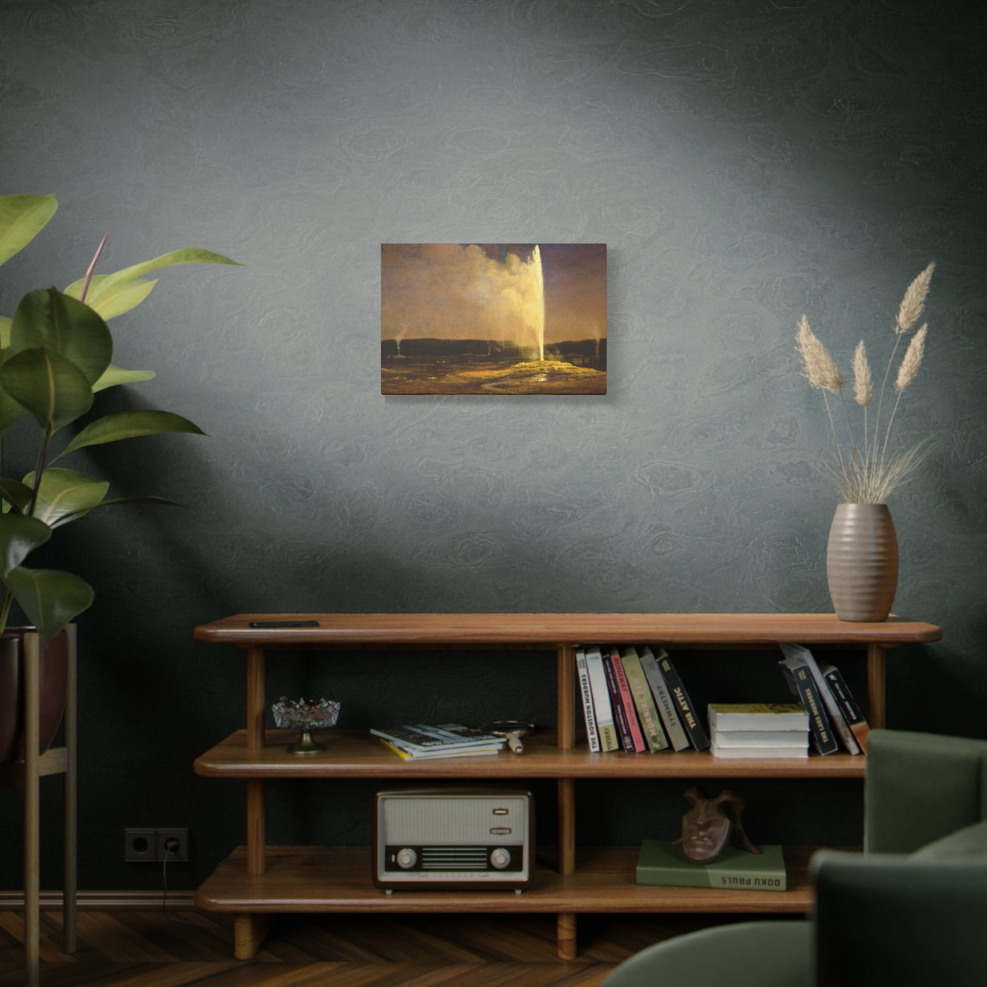 Painted in 1881 by Albert Bierstadt, “Geysers in Yellowstone” gives a glimpse of what Yellowstone was like at the end of the 19th century. Although many parts are unchanged, this print helps to visualize what Yellowstone National Park was like without any aerial tours flying overhead, no buildings and giftshops in the distance, no paved or marked walkways telling you where to walk, no roads, and no traffic. Just raw, unadulterated wilderness rife with hot pots, pools and geysers spewing from the depths.