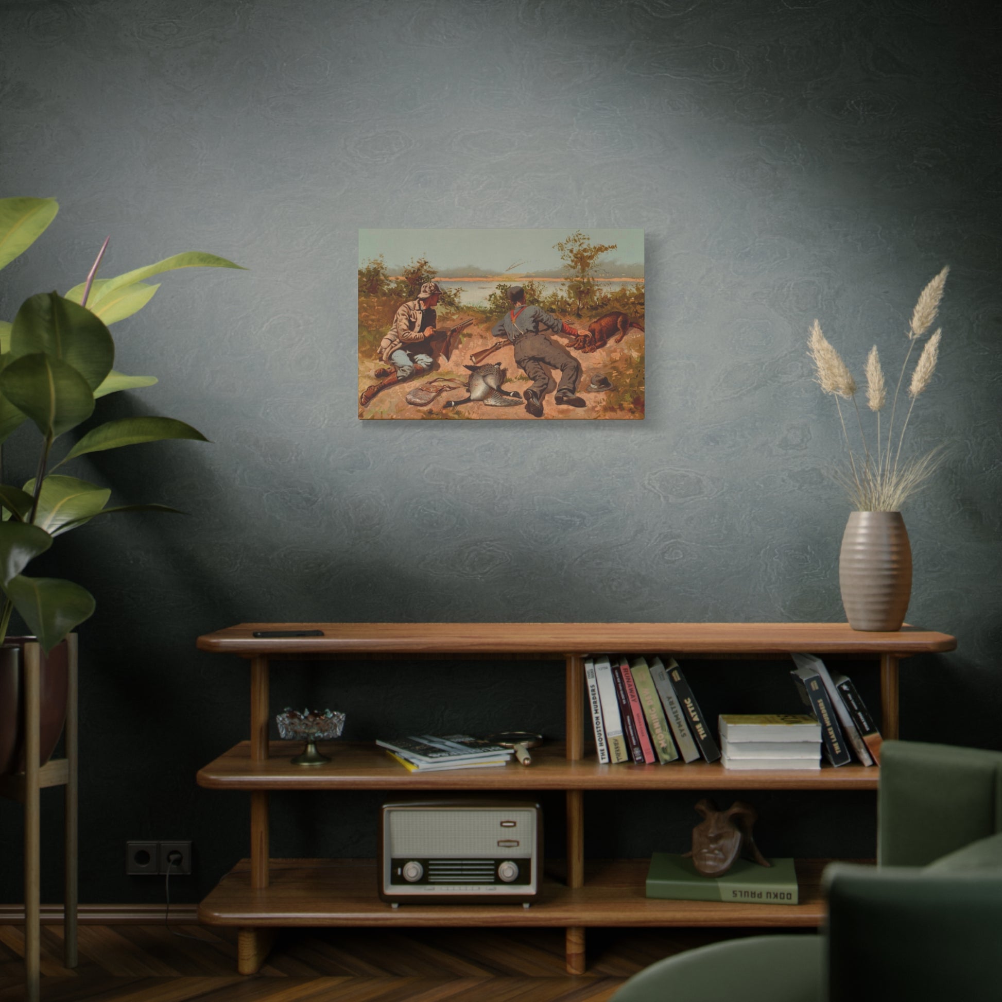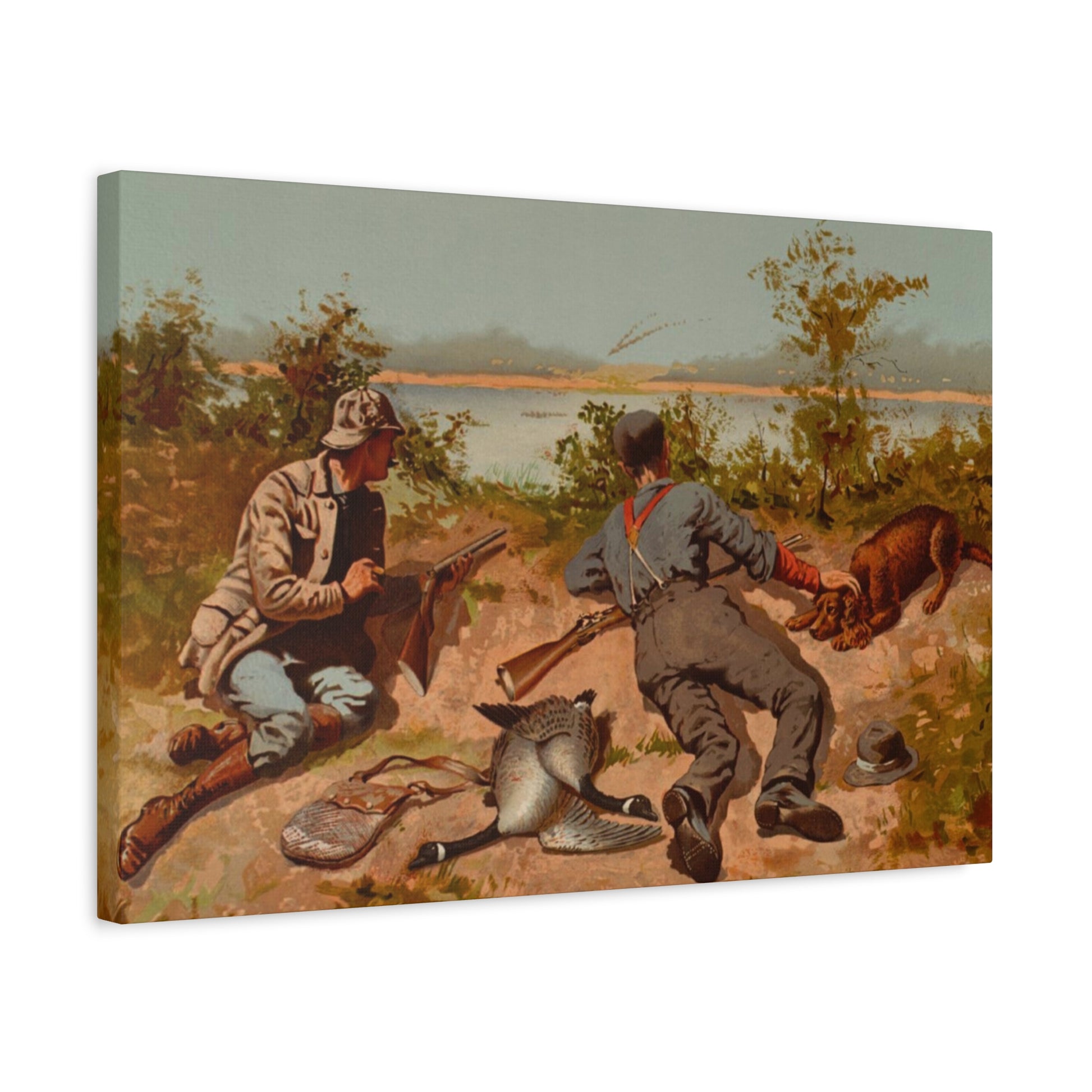 Painted by Frederic Remington, “Goose Shooting” Depicts two hunters lying on a bank beside a body of water. A dog and two dead geese are lying beside them. Geese are flying in a "V" formation in the distant background.