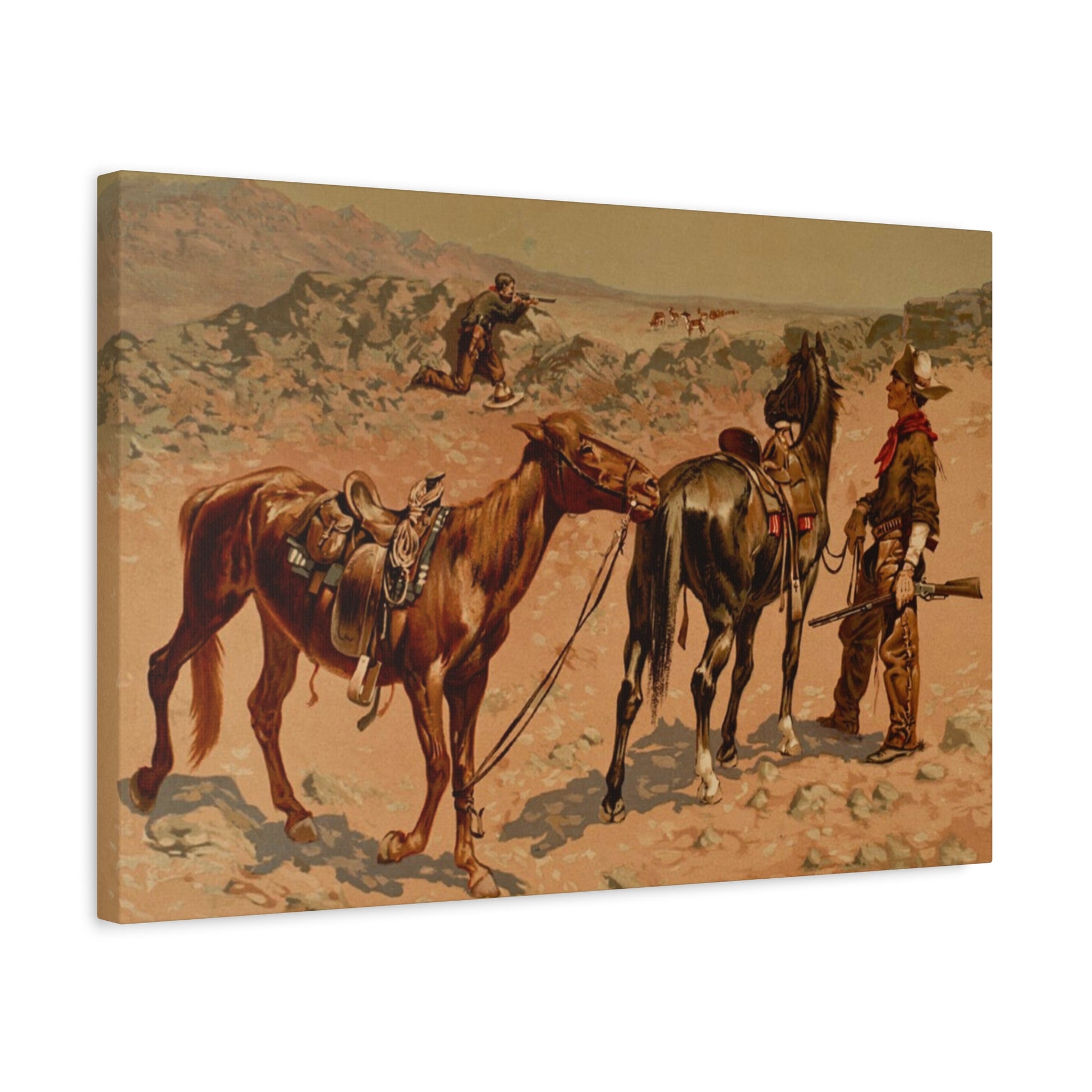 Painted by Frederic Remington, “Hunting Antelope” Depicts two men on barren mesa with the game in the distance. In the foreground, one cowboy is holding a rifle and the reins of his horse while standing near a second saddled and hobbled cow pony. The second hunter is kneeling in the background, shooting at the antelope in the distance.