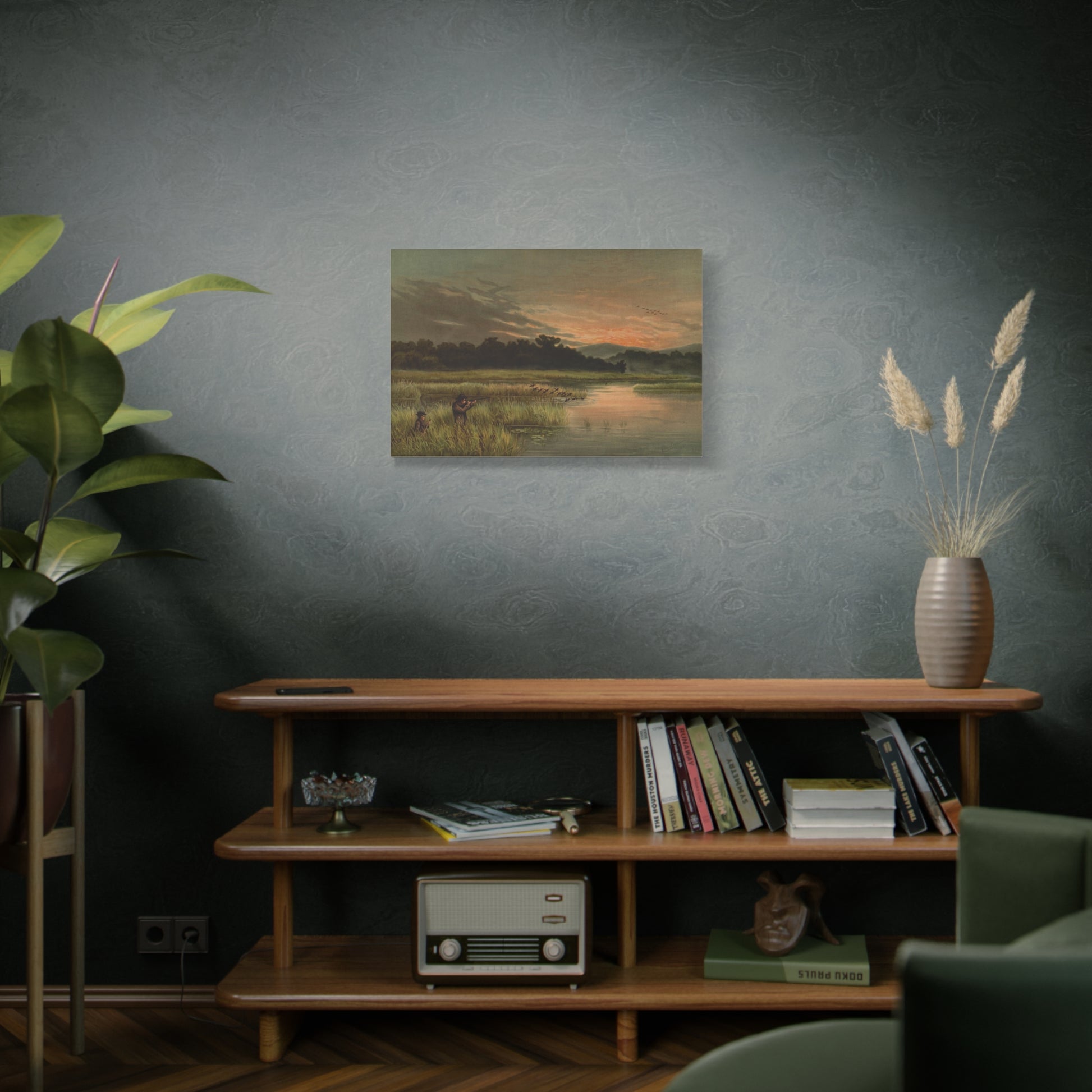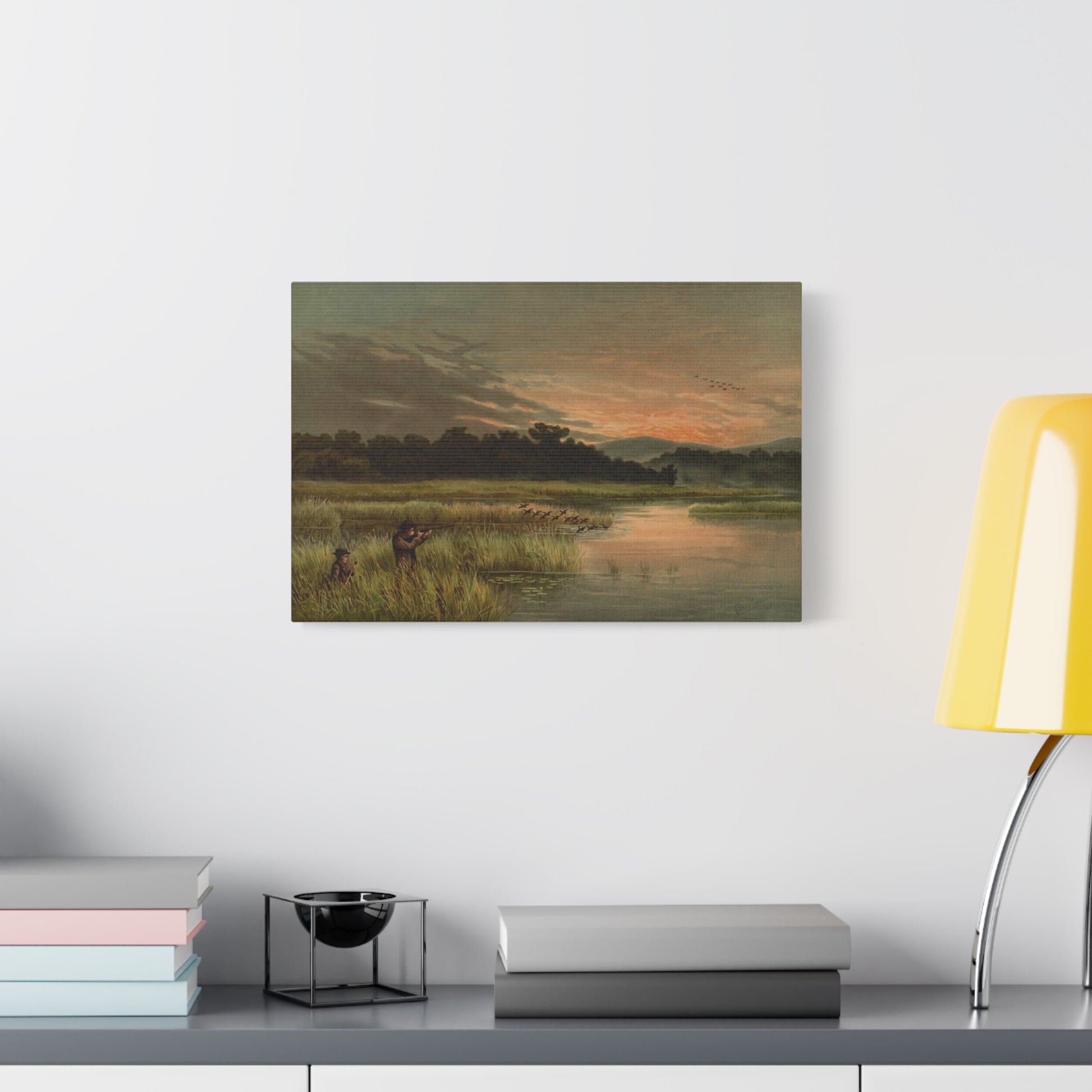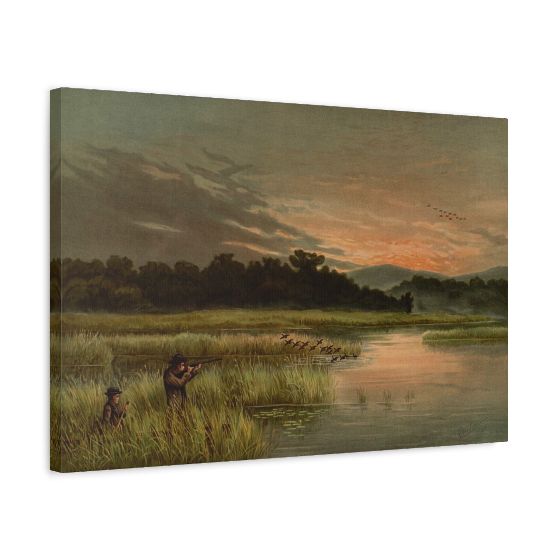 Painted by S. F. Denton, “Mallard Shooting” depicts two men in a boat out in the marsh. One man is shooting at mallard ducks while the other is paddling.