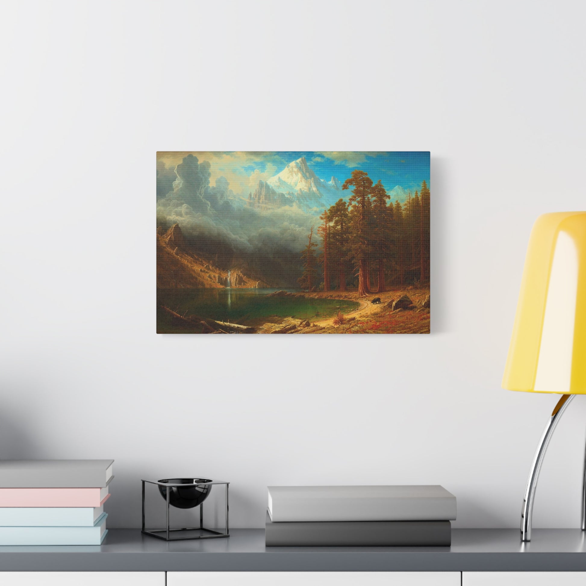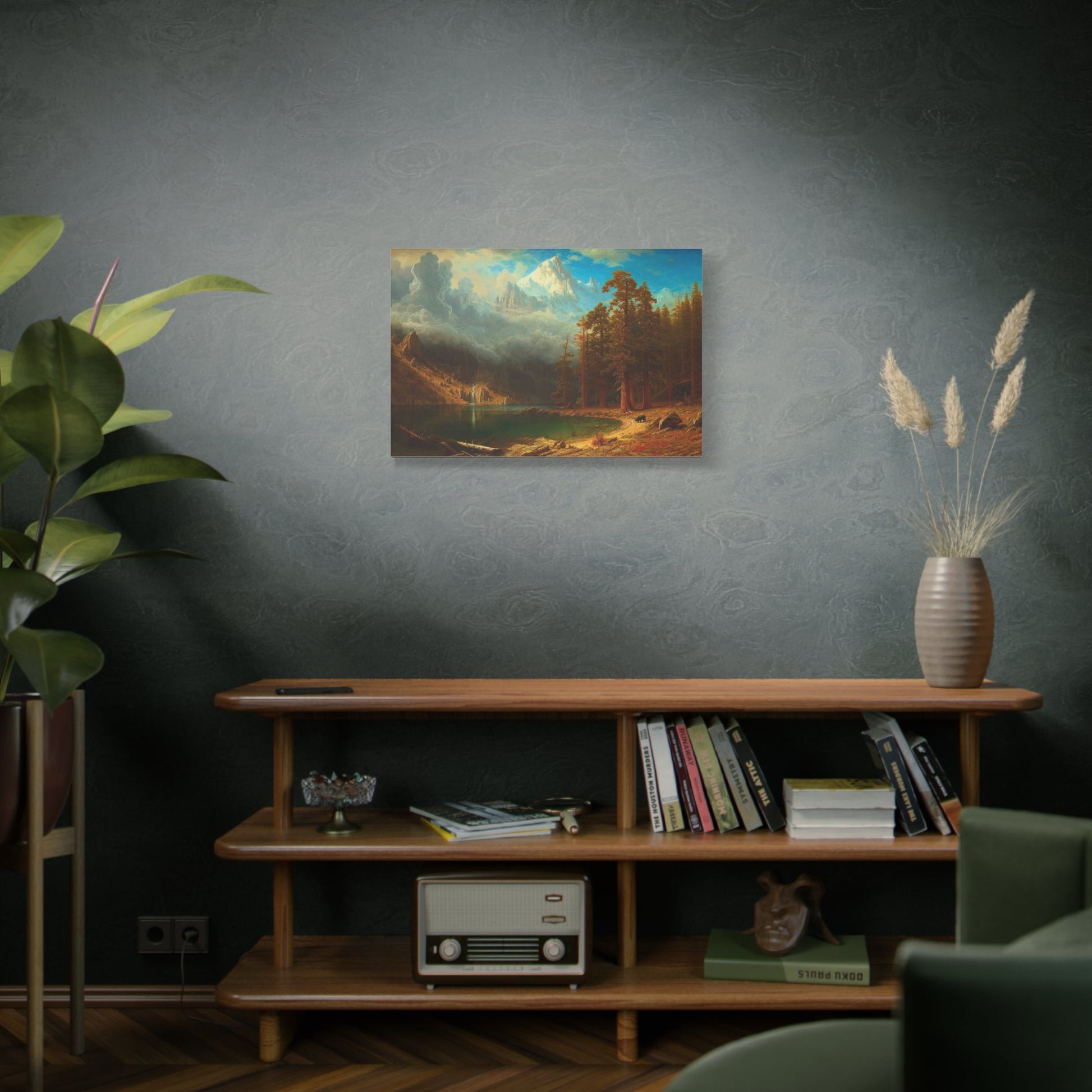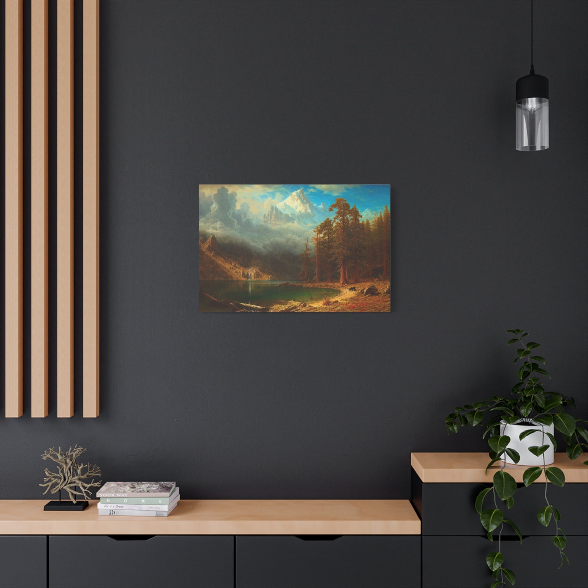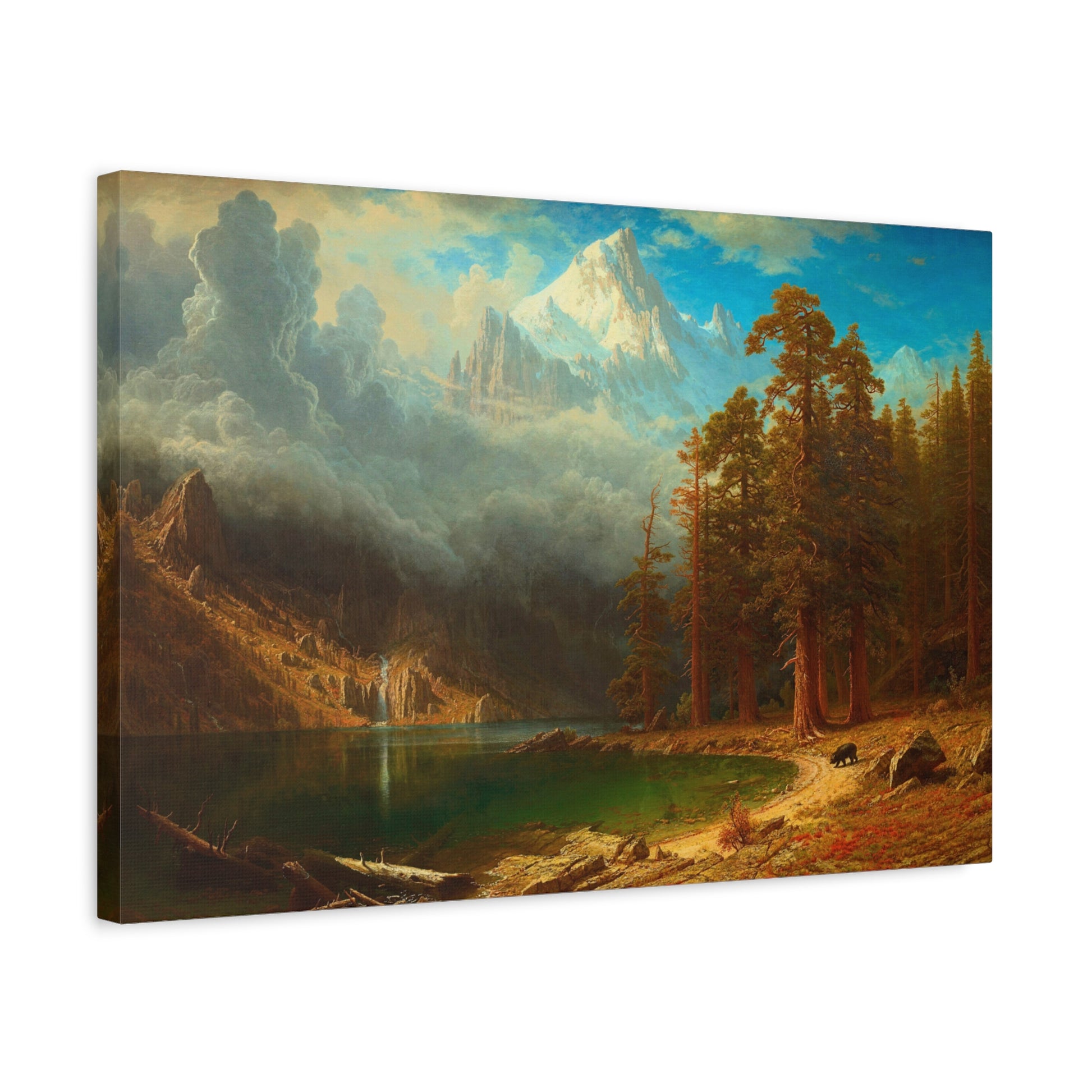 To create this landscape, Albert Bierstadt drew on his experiences seeing the Rocky and Sierra Nevada mountains while traveling through the West in the 1860s. The snow-capped peak, clear mountain lake, and towering pines appear in many of the artist’s Western landscapes. Despite the specific title and convincing sense of place, this scene is imagined, an amalgamation of thoughts and ideas of the vast western expanse.