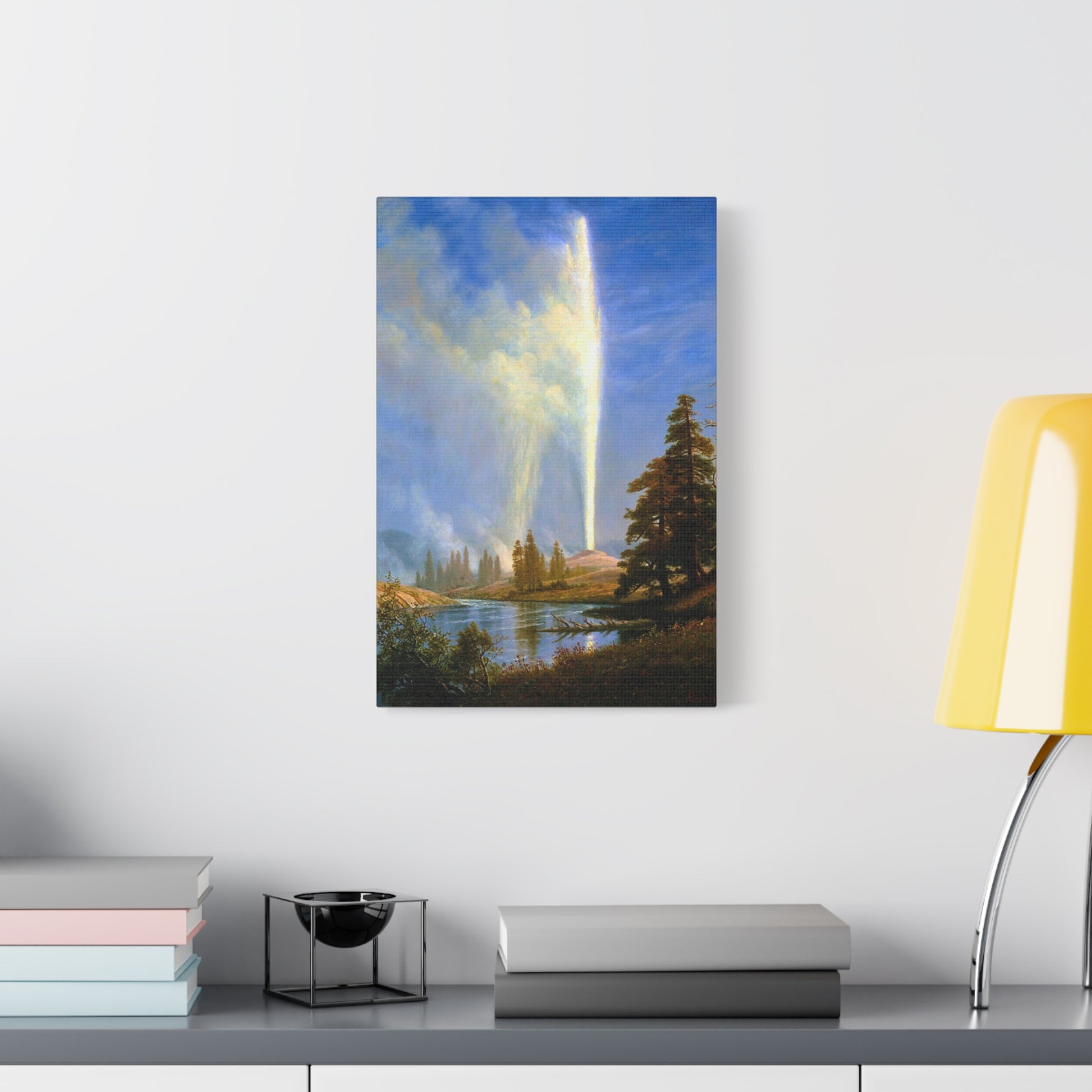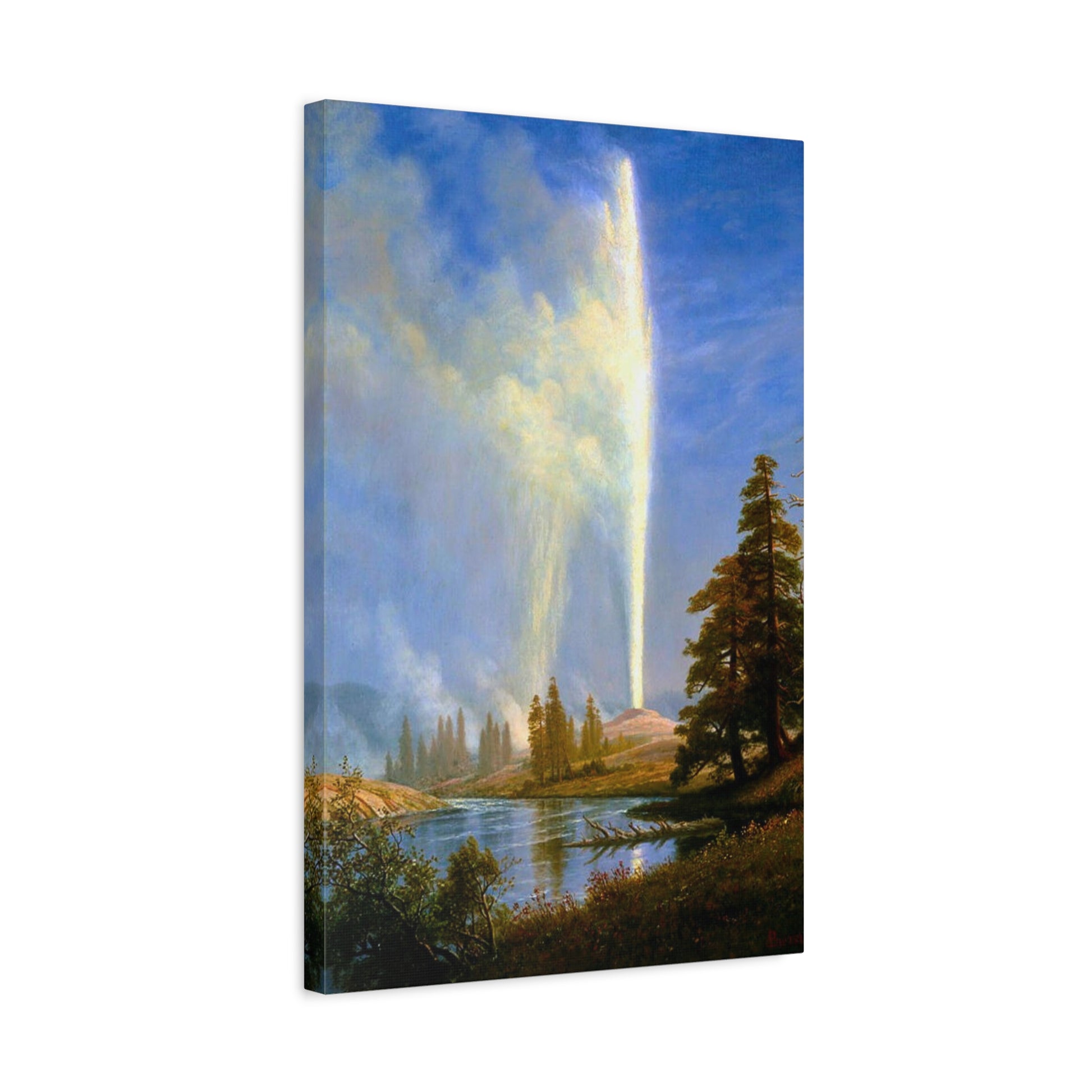 Old Faithful geyser found in Yellowstone National Park has inspired countless works including this one painted in the 1880s by Albert Bierstadt who painted it a couple times. This work, aptly titled “Old Faithful” gives a somewhat unique view of this iconic geothermal feature from down on the banks of the nearby Firehole River.