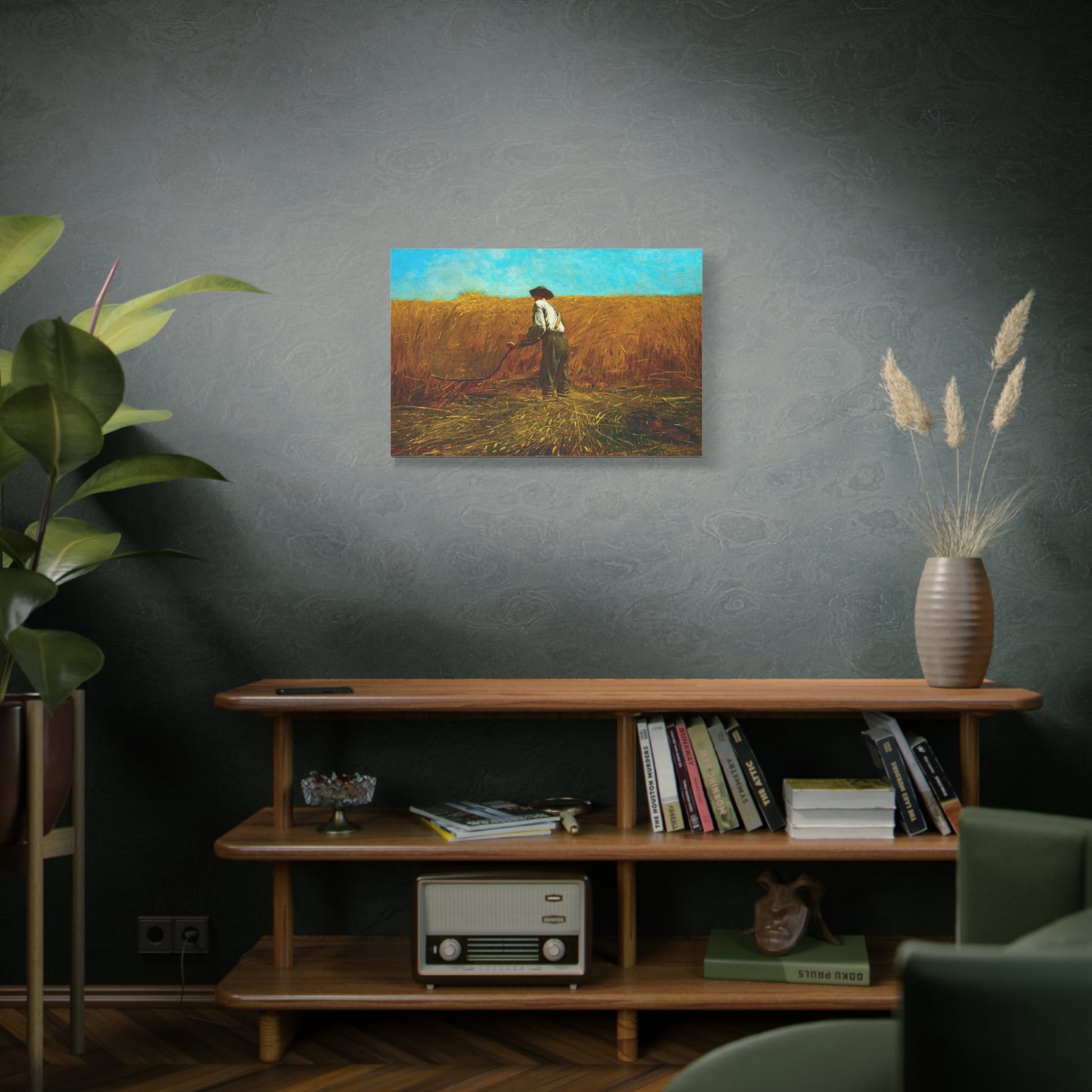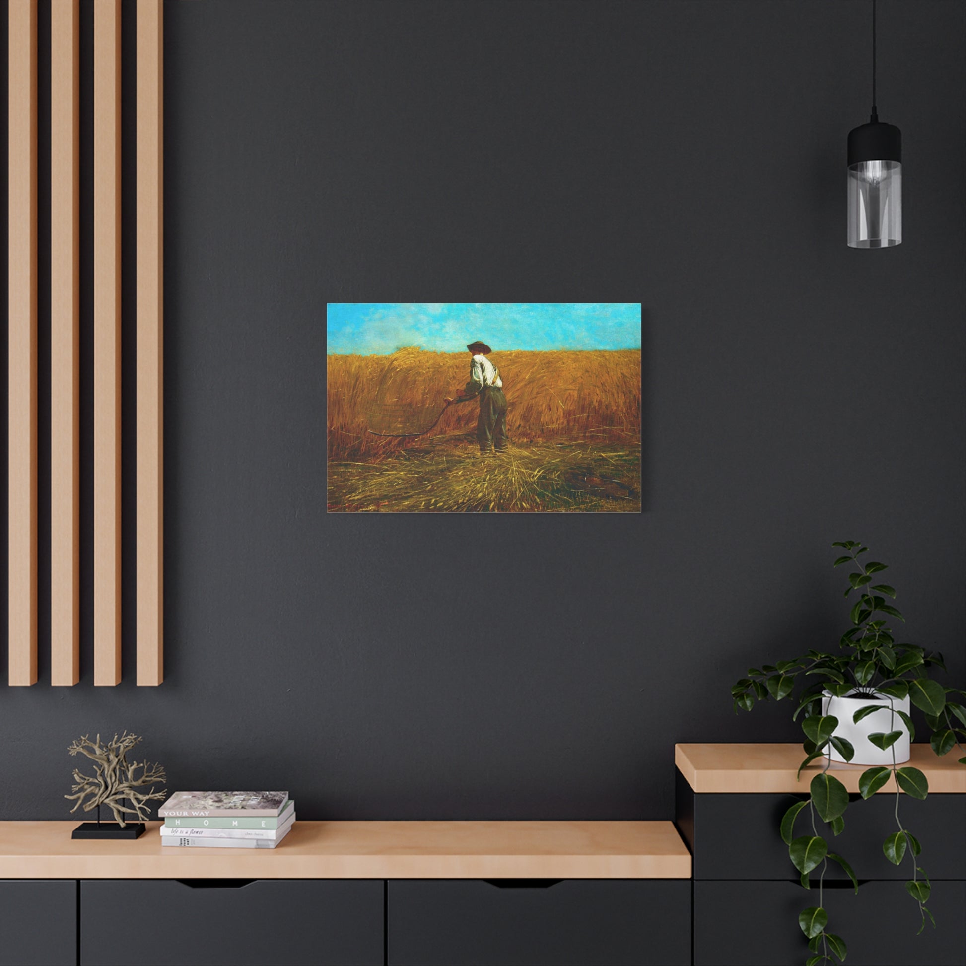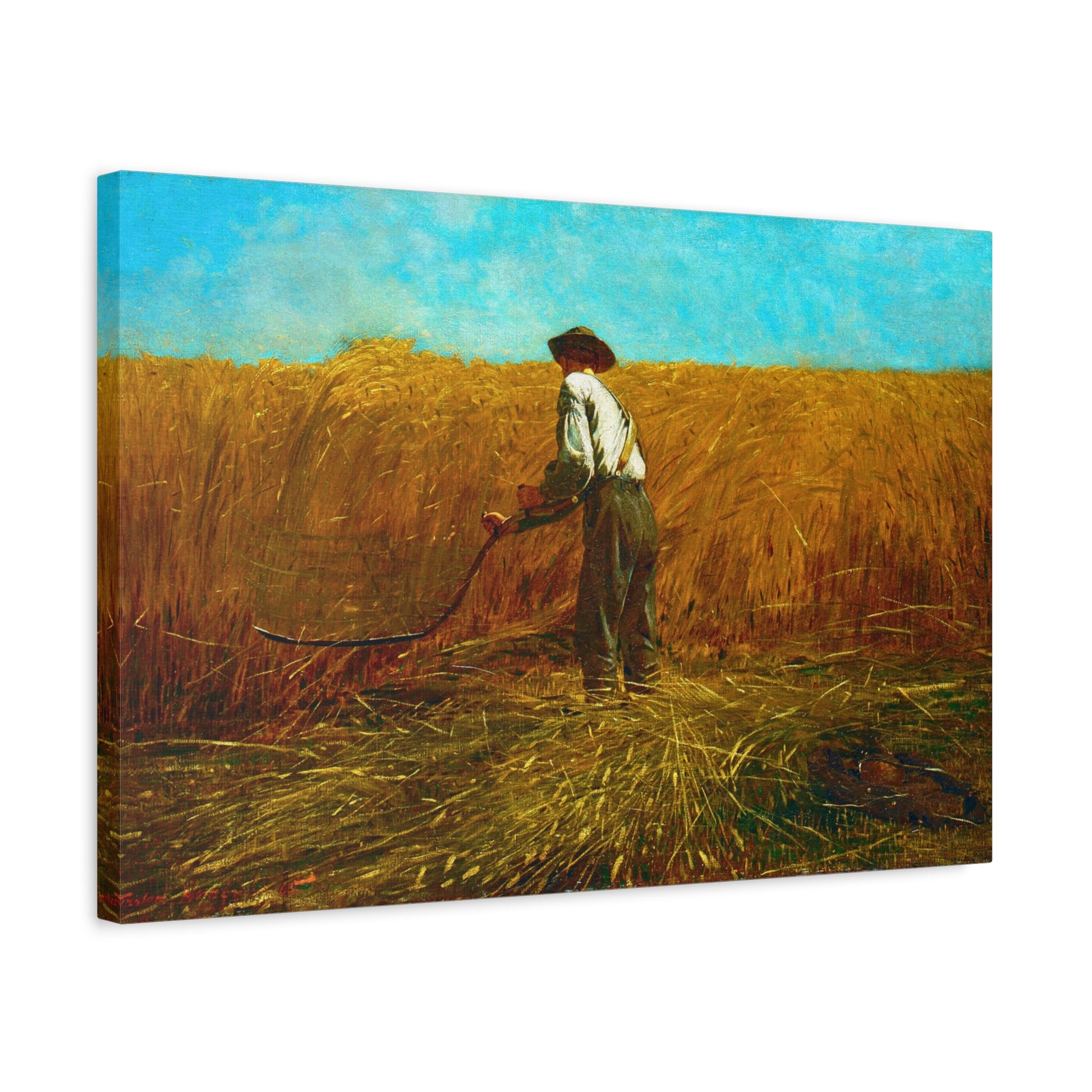 This deeply symbolic painting completed by Winslow Homer shortly after the surrender of General Robert E. Lee and the assassination of President Abraham Lincoln in early 1865 embodies the tension between grief and hope after the American Civil War. A discarded Union Army jacket and canteen in the lower right corner identify the farmer as a veteran, and the titular "new field" contrasts with his old one; the battlefield. The bountiful harvest signifies renewal and recovery, while the scythe reminds us of the grim realities he recently came from. This return to productive, peaceful pursuits echoes the biblical passage from Isaiah 2:4, "And they shall beat their swords into plowshares." It also demonstrates his commitment toward reconstruction; not only for the country, but also for his mind, body and soul.